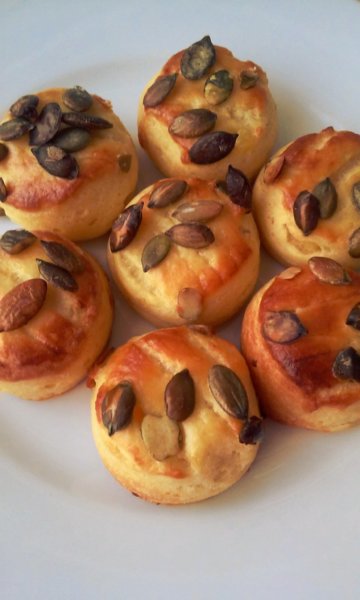 4. Az ujjnyi vastagságú tésztát szúrjuk ki kis méretű pogácsaszaggatóval, majd tegyük őket a sütőlemezre, kenjük meg a tetejüket tojással és szórjuk meg tökmaggal.